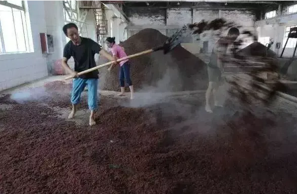 当生沙料的品温降到32℃左右时,加入大曲粉,加曲量控制在投料量的10%左右。加曲粉时应低撒扬匀。拌和后收堆,品温为30℃左右,堆要圆、匀,冬季较高,夏季较矮,堆积时间为4~5天,待品温上升到45~50℃时,可用手插入堆内,当取出的酒醅具有香甜酒味时,即可入窖发酵。